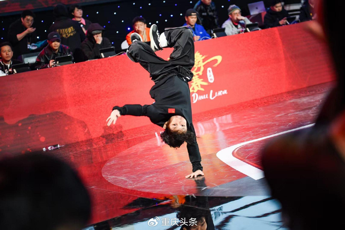 伴随强劲鼓点,他以头顶地倒立,飞速旋转后轻盈落地,干净利落完成整套动作。
